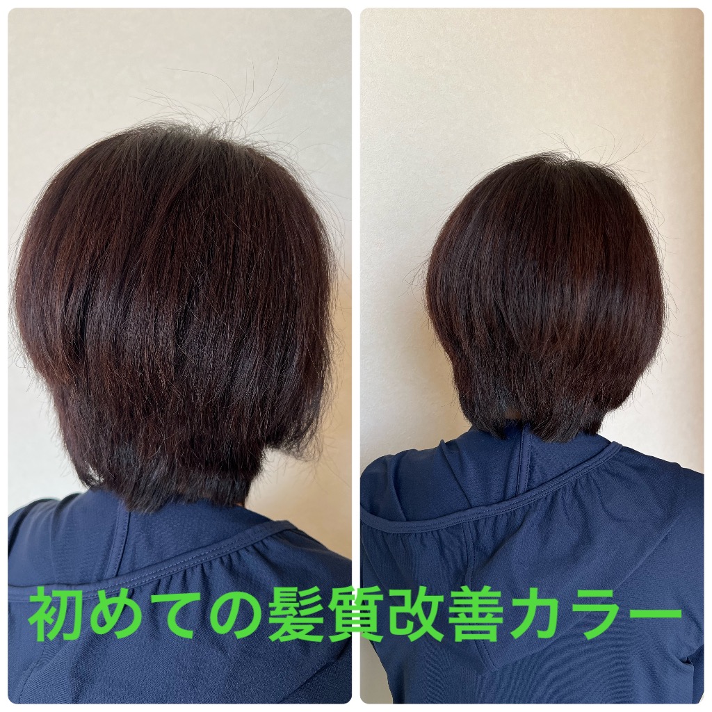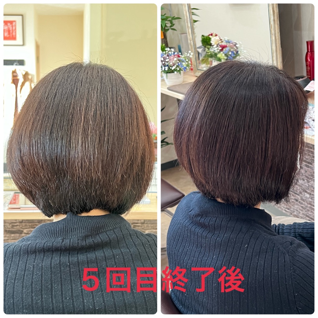 今回は月1回ペースで髪質改善カラーをされているお客様の最初と5回目終了後のお写真を掲載させていただきます。